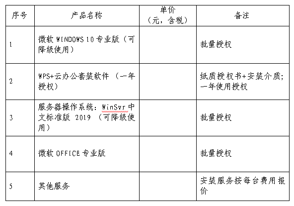 我公司為完成辦公軟件正版化采購項目,現(xiàn)開展詢價采購,向貴公司(下稱:供方)進行詢價,請貴公司按照以下內(nèi)容進行報價: