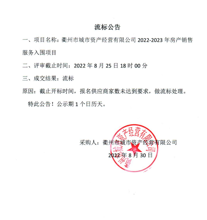 衢州市城市資產經營有限公司2022-2023年房產銷售服務入圍項目流標公告