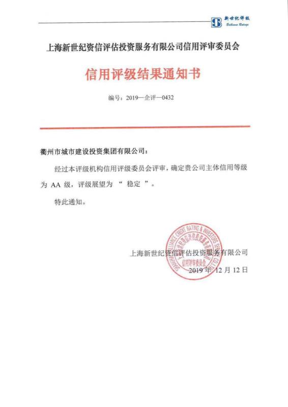 12月12日,國內(nèi)權(quán)威機構(gòu)上海新世紀資信評估投資服務(wù)有限公司發(fā)布信用評級報告,審定衢州市城市投資集團有限公司主體信用等級為AA,評級展望為“穩(wěn)定”。