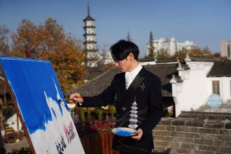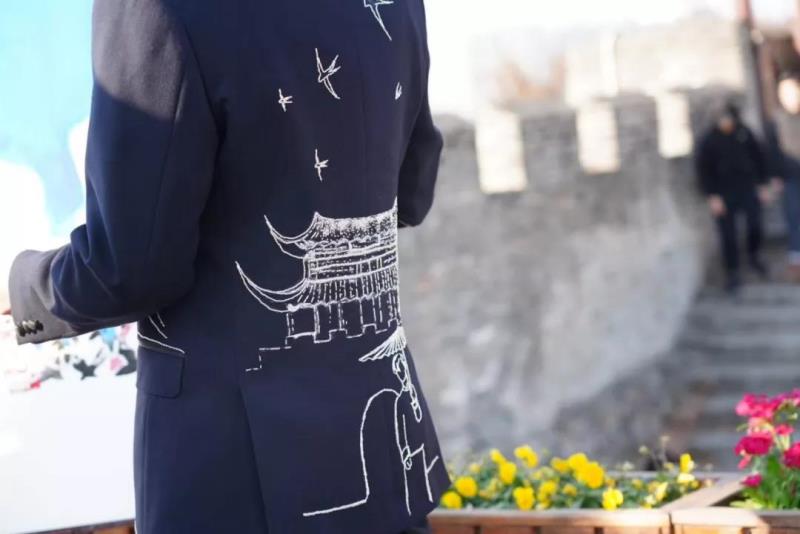 視頻中,何平身著有天王塔元素的西服,并置身在天王塔下邊觀摩婺劇表演者的表演,邊用畫(huà)筆一筆一畫(huà)畫(huà)出婺劇演員最精髓的表情和動(dòng)作,并和澳門(mén)的景色結(jié)合在一起,別有一番韻味。