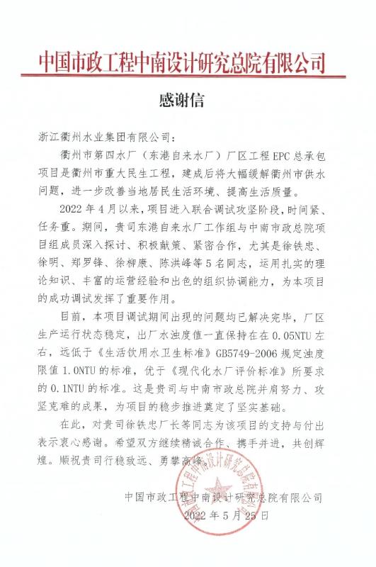 近日,市城投水業(yè)集團(tuán)收到一封中國市政工程中南設(shè)計總院有限公司發(fā)來的感謝信。信中,中國市政工程中南設(shè)計總院對市城投水業(yè)集團(tuán)東港自來水廠工作組在項目聯(lián)合調(diào)試階段積極獻(xiàn)策、緊密合作,為項目成功調(diào)試所發(fā)揮的重要作用表示了感謝。